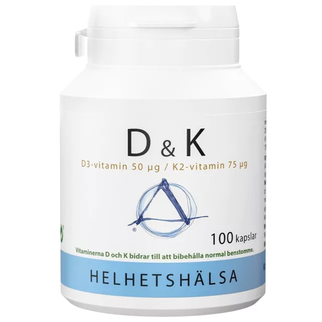 D & K är ett kombinerat tillskott med vitaminerna D och K som bidrar till att bibehålla en normal benstomme. D&K kommer i vegetabiliska kapslar av cellulosa.
