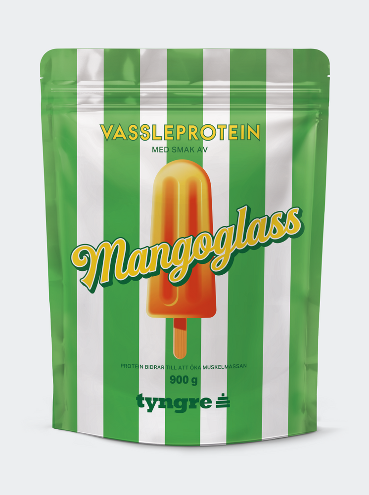 Proteinpulver med smak av mangoglass. Innehåller sötningsmedel. Protein bidrar till att öka muskelmassan. Vi rekommenderar en varierad och balanserad kost och hälsosam livsstil. Innehåll: 900 gram, vilket motsvarar ca 26 portioner. Skopa medföljer inte. Användning: 1 skopa (ca 35 g) blandas med 3-4 dl vatten eller mjölk. Ett dl-mått motsvarar ca 35 g pulver (en portion). Förvaring: Förvaras torrt i rumstemperatur. Konsumentkontakt: konsument@tyngredistribution.se – www.tyngre.se Tillverkat i Sverige för Tyngre Distribution AB