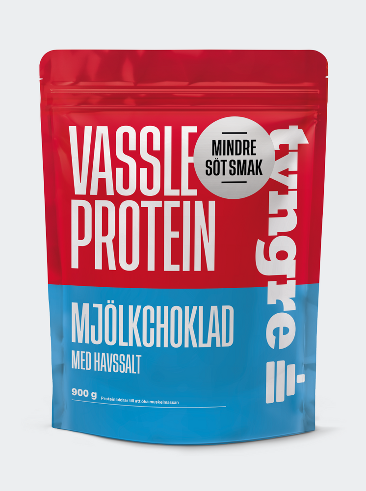 Proteinpulver med smak av mjölkchoklad med havssalt. Innehåller sötningsmedel. Protein bidrar till att öka muskelmassan. Vi rekommenderar en varierad och balanserad kost och hälsosam livsstil. Shake: Blanda 1 dl pulver (ca 35 g) med 2–3 dl kallt vatten eller mjölk. Innehåll: 900 gram, vilket motsvarar ca 26 portioner. Skopa medföljer inte. Användning: 1 skopa (ca 35 g) blandas med 3-4 dl vatten eller mjölk. Ett dl-mått motsvarar ca 35 g pulver (en portion). Förvaring: Förvaras torrt i rumstemperatur. Konsumentkontakt: konsument@tyngredistribution.se – www.tyngre.se Tillverkat i Sverige för Tyngre Distribution AB