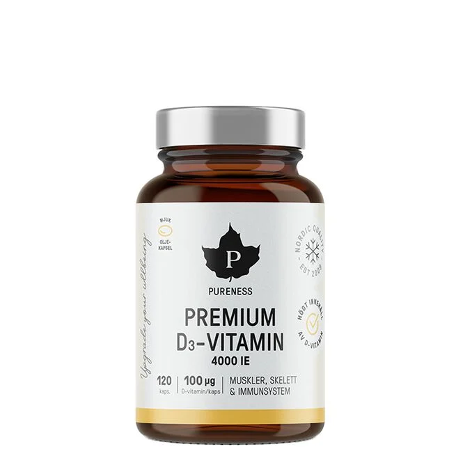 Pureness Premium D-Vitamin är ett tillskott av vitamin D3. Kapslarna är mjuka och innehåller torskleverolja, vilket naturligt bidrar med både vitamin D och A. Den höga absorptionen av vitamin D säkerställs genom användning av fiskleverolja. Dessutom innehåller tillskottet D3 från fårullsfett. Varje kapsel ger 100 mcg vitamin D3. Vitamin D bidrar till normal funktion av muskler, benstomme och immunsystem.